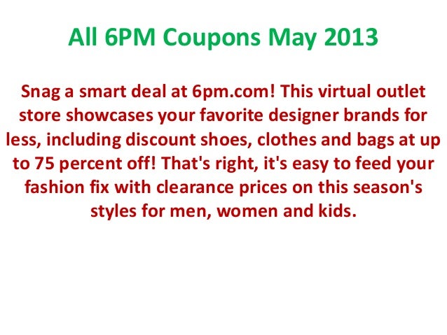 50% Off 6PM Coupons & Promo Codes | March 2022 About 6PM Discounts. Take a look at our 24 active 6PM coupons for March, 2022. Save up to 50% off with our best 6PM coupon. Save Up To 50% Off On Handbags. Highest ever 6PM discount: $195.01 Off Coach Montana. Latest 6PM Offer: Save 71% Off On Velour Polo Set With Wide Leg Pants.