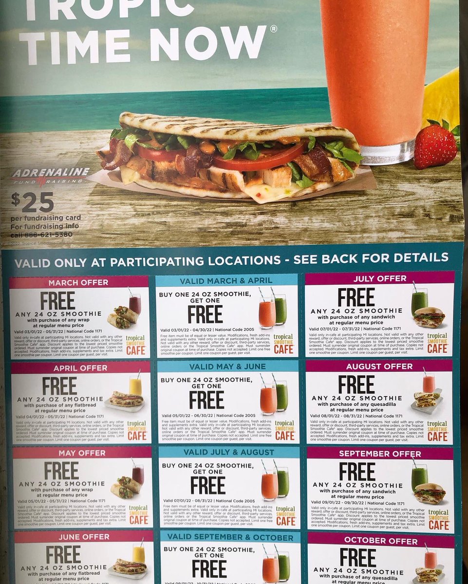 $5 off Tropical Smoothie Cafe Coupons & Specials (Sept. 2022) - Offers.com N/A. Sale. Free Smoothie on your Birthday. N/A. Sale. Wraps, Sandwiches and Salads - Catering from Tropical Smoothie. N/A. $5 Off. Earn $5 for Every $55 Spent with the Tropical Rewards App.