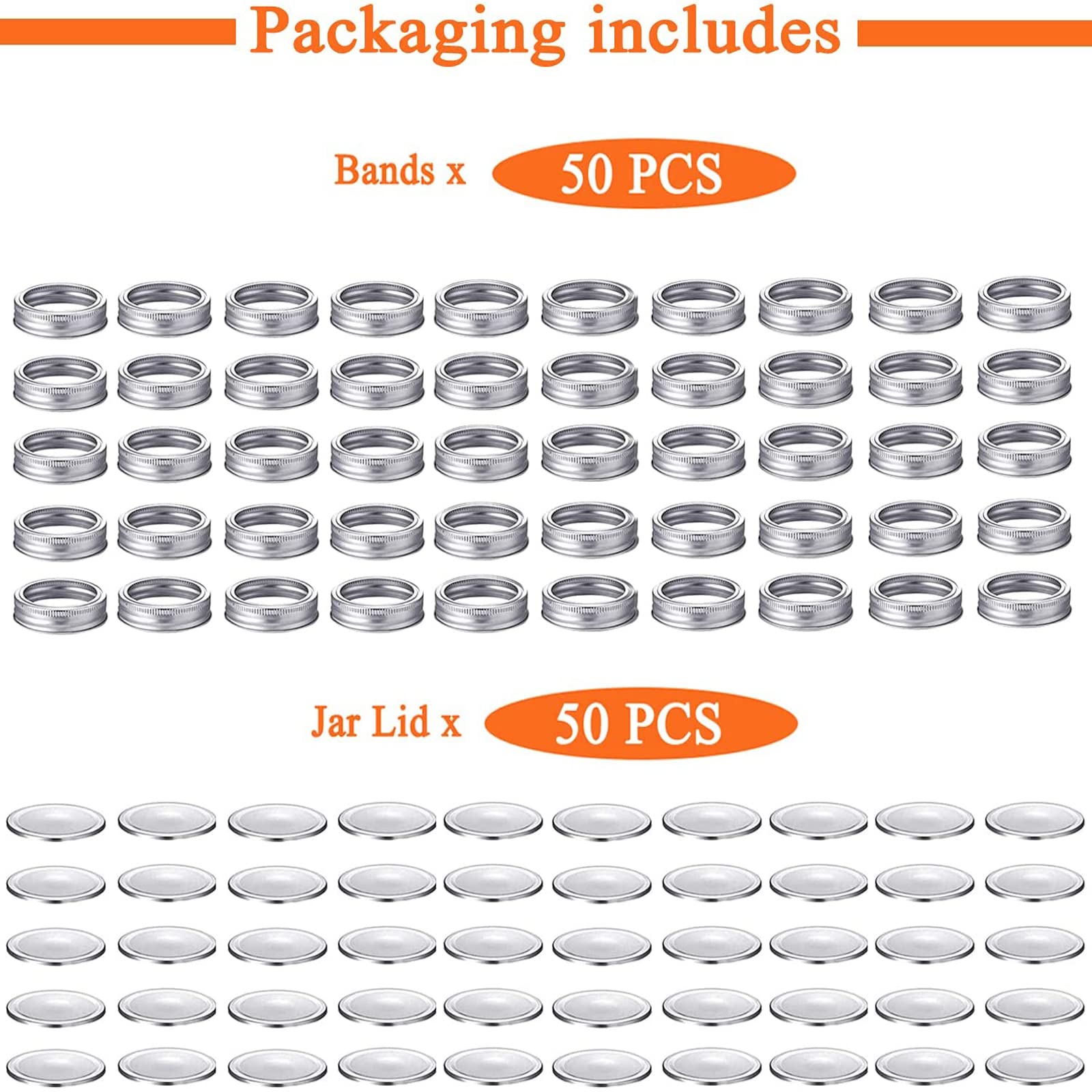 100 PCS Wide Mouth Canning Lids and Rings for Ball, Kerr Jars - Mason Canning Jar Split-Type Lids Bands with Silicone Seals - Silver