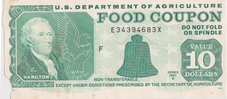 10 Dollars United States Department of Agriculture Food Coupon Food Coupon issued by the US Department of Agriculture. Coupon printed in green ink depicting a portrait of Alexander Hamilton and a bald eagle illustration as a primary image with a tactile "liberty bell" serving as a secondary image in a field of stars, Right side of coupon is perforated as coupons were issued in booklets Intaglio print web border on right side and around coupon value.